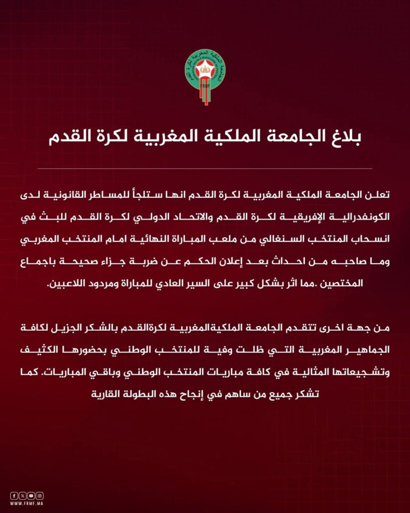 أعلنت الجامعة الملكية المغربية لكرة القدم، في بلاغ رسمي، عزمها اللجوء إلى المساطر القانونية لدى كل من الكونفدرالية الإفريقية لكرة القدم (كاف) والاتحاد الدولي لكرة القدم (فيفا)، على خلفية ما وصفته بـالاستفزازات التي تعرّض لها المنتخب المغربي من طرف المنتخب السنغالي خلال المباراة النهائية لكأس الأمم الإفريقية.