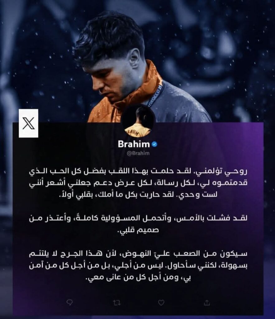 وأضاف لاعب “أسود الأطلس” أنه فشل في تلك اللحظة الحاسمة، ويتحمّل المسؤولية كاملة من صميم قلبه، مشددًا على أن النهوض من جديد لن يكون سهلًا، لكنه سيواصل المحاولة من أجل المنتخب، ومن أجل كل من آمن به وسانده.